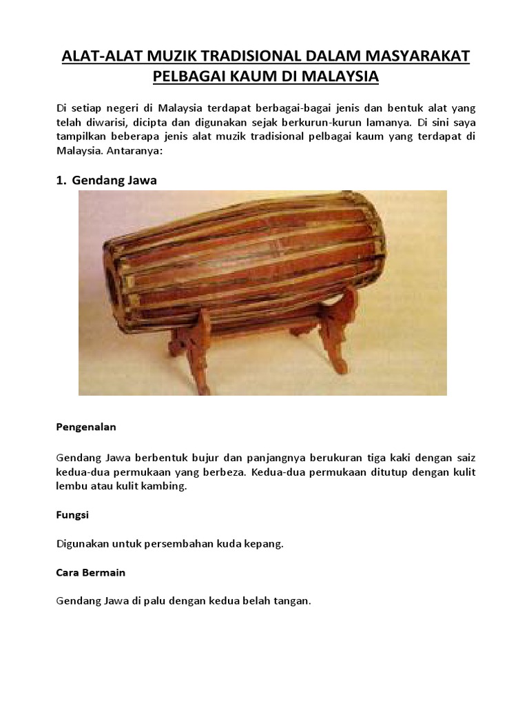 Gendang ialah alat muzik yang diperbuat daripada kulit haiwan seperti lembu atau kambing. Setiap bangsa seperti cina, melayu dan india mempunyai gendang dengan nama yang tersendiri. Interested in flipbooks about alat muzik tradisional (new)? Di malaysia, jumpaan terawal bentuk awal gong adalah gendang dong son yang dijumpai di batu buruk, terengganu pada 1974. Gong telah banyak dijumpai di seluruh semenanjung indochina dan kepulauan nusantara sebagai alat utama dalam upacara khas dan persembahan muzik tradisional.